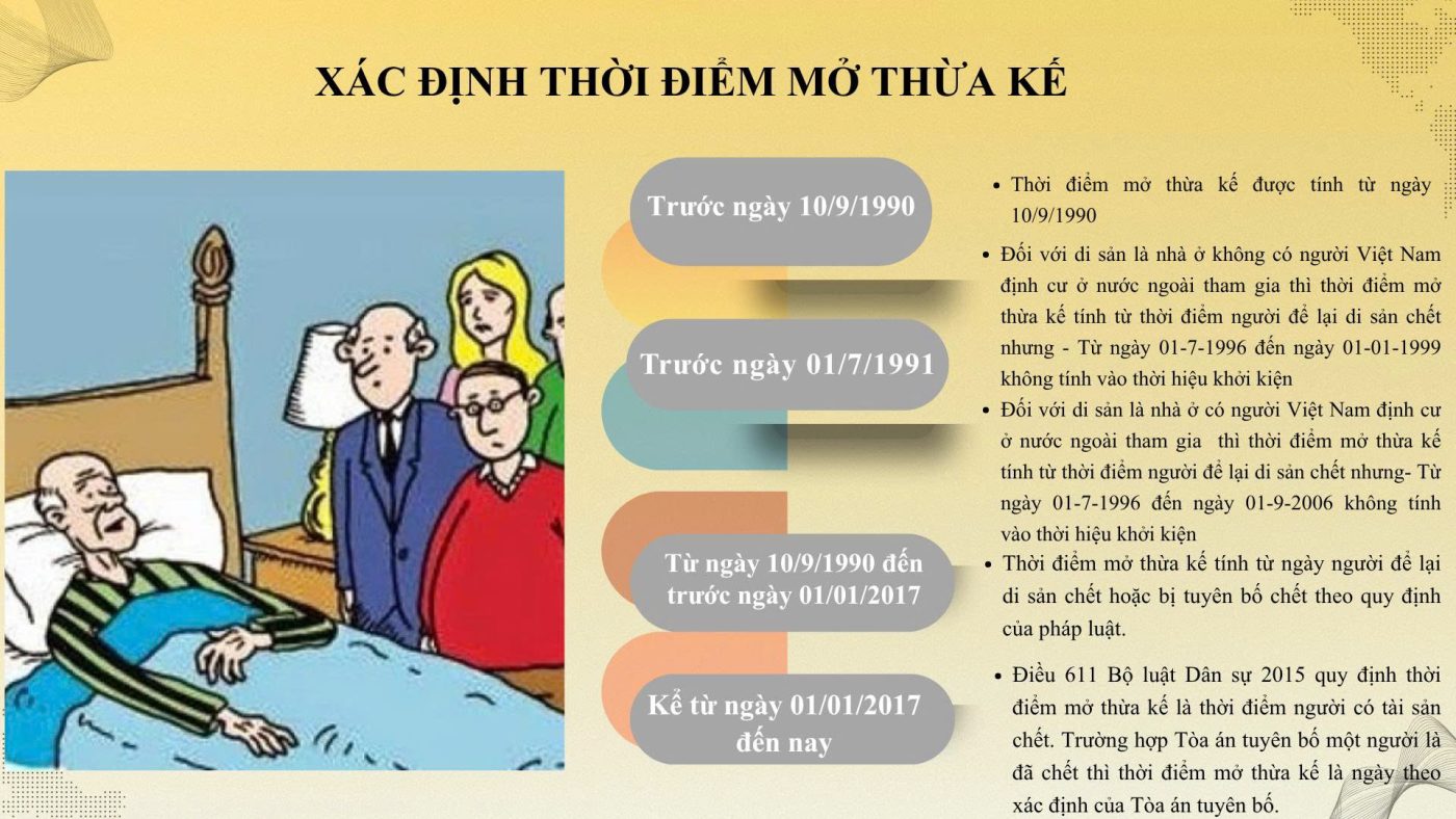 Xác định thời điểm bắt đầu thời hiệu/không tính thời hiệu Thời hiệu từ ngày 10/9/1990 Từ ngày 01-7-1996 đến ngày 01-01-1999 không tính vào thời hiệu khởi kiện Từ ngày 01-7-1996 đến ngày 01-9-2006 không tính vào thời hiệu khởi kiện Thời hiệu kể từ thời điểm mở thừa kế